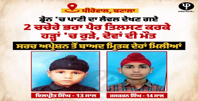 ਕਸਬਾ ਸ਼੍ਰੀ ਹਰਗੋਬਿੰਦਪੁਰ ਸਾਹਿਬ ਦੇ ਪਿੰਡ ਧੀਰੋਵਾਲ ਵਿੱਚ ਬਰਸਾਤੀ ਨਾਲੇ ਵਿੱਚ ਪਾਣੀ ਦੇਖਣ ਗਏ ਦੋ ਬੱਚਿਆਂ ਦੀ ਡੁੱਬਣ ਕਾਰਨ ਮੌਤ ਹੋ ਗਈ ਹੈ। ਮ੍ਰਿਤਕਾਂ ਦੀ ਪਛਾਣ ਜਸਕਰਨ ਸਿੰਘ (14) ਤੇ ਦਿਲਪ੍ਰੀਤ ਸਿੰਘ (13) ਵਜੋਂ ਹੋਈ ਹੈ।
